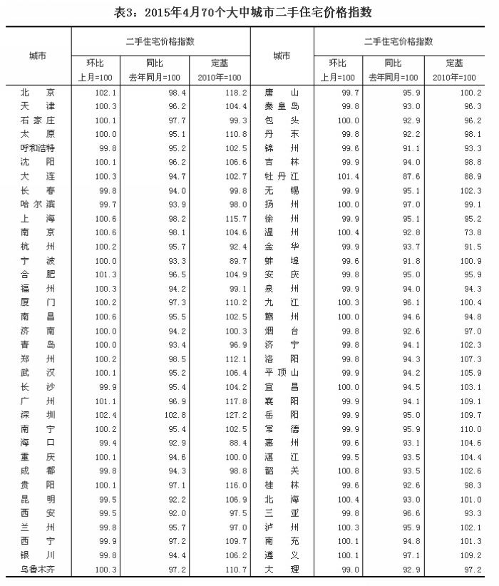 (二)与去年同月相比,70个大中城市中,价格下降的城市有69个,上涨的城市有1个。4月份,同比价格变动中,最高涨幅为0.7%,最低为下降10.3%。