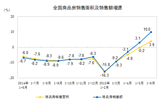1-6月份,商品房销售面积50264万平方米,同比增长3.9%,1-5月份为下降0.2%。其中,住宅销售面积增长4.5%,办公楼销售面积下降2.4%,商业营业用房销售面积增长3.5%。商品房销售额34259亿元,增长10.0%,增速提高6.9个百分点。其中,住宅销售额增长12.9%,办公楼销售额下降1.8%,商业营业用房销售额下降1.2%。