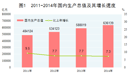 经济增长保持中高速。2011-2014年,国内生产总值年均增长8.0%,由高速增长转为中高速增长。分年度看,2011年比上年增长9.5%,2012、2013年均增长7.7%,2014年增长7.3%,2015年上半年增长7.0%。“十二五”期间,预计我国经济年均增长近8%,不仅高于同期世界2.5%左右的年均增速,在世界主要经济体中也名列前茅。