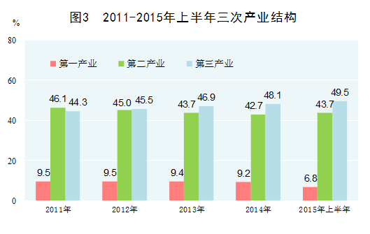 服务业成为第一大产业。随着我国经济发展水平的提高,对生产性和生活性服务的需求不断扩大,服务业在国民经济中的地位上升。2012年,我国第三产业现价增加值占国内生产总值的比重上升到45.5%,首次超过第二产业成为国民经济第一大产业。2014年,第三产业比重上升到48.1%,比2010年提高3.9个百分点,2015年上半年进一步上升到49.5%。