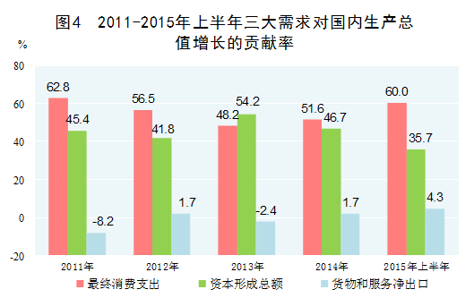 内需特别是消费对经济增长贡献明显增强。在扩大内需战略的带动下,消费的基础性作用和投资的关键性作用得到较好发挥,特别是消费结构升级带动居民消费潜力有序释放,消费成为拉动经济增长的主动力。2011-2014年,最终消费对经济增长的年均贡献率为54.8%,高于投资贡献率7.8个百分点。2015年上半年,消费对经济增长的贡献率上升为60%。