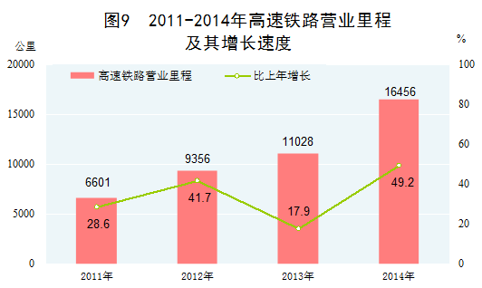 交通运输能力持续增强。高效、便捷的铁路网、公路网、航空运输网、城际铁路网、航道网逐渐形成。2014年末,铁路营业里程、公路里程、高速公路里程、定期航班航线里程分别达到11.2万公里、446.4万公里、11.2万公里、463.7万公里,分别比2010年末增长22.6%、11.4%、51.0%、67.7%。特别是,高速铁路迎来了史无前例的大发展,2014年高速铁路运营里程突破1.6万公里,位居世界第一,我国高铁还驶出国门,参与多国铁路建设,成为独具特色、彰显国力的中国名片。