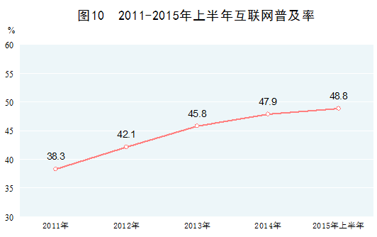 信息通信发展水平快速提高。2014年,我国邮电业务总量21846亿元(按2010年不变价格计算),比2010年增长90.4%,年均增长17.5%。移动互联网产业方兴未艾,“宽带中国”战略加快实施。2014年末,移动电话用户、互联网上网人数分别达到12.9亿户、6.5亿人,分别比2010年增长49.7%、41.9%;移动电话普及率、互联网普及率分别达到94.5部/百人、47.9%,分别比2010年提高30.1部/百人、13.6个百分点。