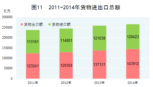 进出口贸易规模稳步扩大。尽管国际金融危机以来世界经济复苏步履蹒跚,但由于党中央国务院积极应对,我国进出口贸易总体上保持了稳定增长,占国际贸易的份额继续上升。2014年,我国货物进出口总额达到26.4万亿元,居世界第一位,比2010年增长31.0%,年均增长7.0%。货物进出口总额占世界贸易总额的比重为11.3%,比2010年提高1.7个百分点。