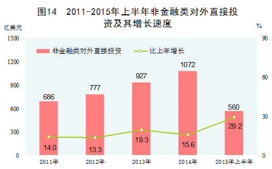 “走出去”战略加快实施。对外投资进入加速发展阶段,沿海开放、沿边开放展现新格局。2014年,非金融类对外直接投资1072亿美元,比2010年增长78.1%,年均增长15.5%,2015年上半年非金融类对外直接投资同比增长29.2%。2014年,对外承包工程业务完成营业额1424亿美元,比2010年增长54.5%,年均增长11.5%。自贸区建设取得重要突破,2013年我国在上海设立了首个自由贸易园区,此后又新设广东、天津、福建自由贸易园区;与冰岛、瑞士自贸区启动实施,中韩、中澳自贸区完成实质性谈判。积极推进丝绸之路经济带和21世纪海上丝绸之路合作建设,参与境外基础设施建设和产能合作,在铁路、电力、通信、油气等领域对外合作取得重要成果。
