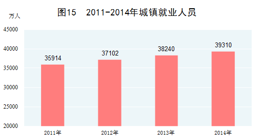 就业稳步增加。高度重视就业工作,以改革促进大众创业、万众创新,在经济增速放缓的背景下就业总量不降反升。2014年末,全国就业人员达到77253万人,比2010年末增加1148万人。其中,城镇就业人员增加到39310万人,占全部就业人员的比重为50.9%,比2010年末提高5.3个百分点。2014年农民工总量为27395万人,比2010年增长13.1%,年均增长3.1%。2015年上半年新增就业718万人,完成全年目标的71.8%。