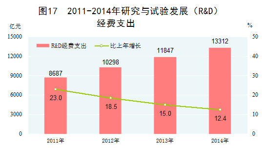 科技事业成果丰硕。2014年,研究与试验发展(R&D)经费支出13312亿元,比2010年增长88.5%,占国内生产总值的比重为2.09%,比2010年提高0.36个百分点。专利申请量和授权量大幅增加。2014年,受理境内外专利申请236万件,授予专利权130万件,分别比2010年增长93.2%和59.9%。基础研究和前沿技术研究取得一批重大成果,探月工程、载人深潜、卫星应用、超级计算等重大科研项目取得新突破,为产业转型升级提供了强有力的技术支撑。