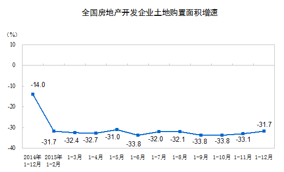2015年,房地产开发企业土地购置面积22811万平方米,比上年下降31.7%,降幅比1-11月份收窄1.4个百分点;土地成交价款7622亿元,下降23.9%,降幅收窄2.1个百分点。