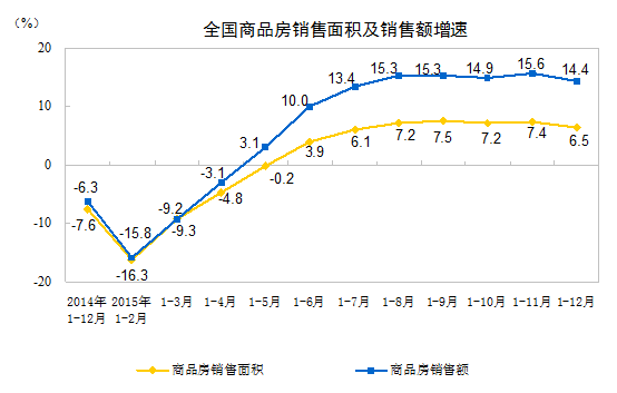 2015年,商品房销售面积128495万平方米,比上年增长6.5%,增速比1-11月份回落0.9个百分点。其中,住宅销售面积增长6.9%,办公楼销售面积增长16.2%,商业营业用房销售面积增长1.9%。商品房销售额87281亿元,增长14.4%,增速回落1.2个百分点。其中,住宅销售额增长16.6%,办公楼销售额增长26.9%,商业营业用房销售额下降0.7%。