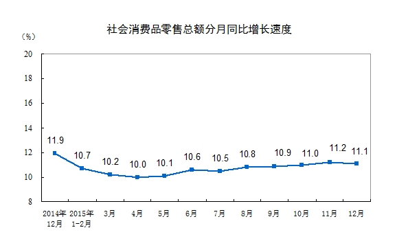按经营单位所在地分,12月份,城镇消费品零售额24566亿元,同比增长10.9%;乡村消费品零售额4069亿元,增长12.0%。2015年全年,城镇消费品零售额258999亿元,比上年增长10.5%;乡村消费品零售额41932亿元,增长11.8%。