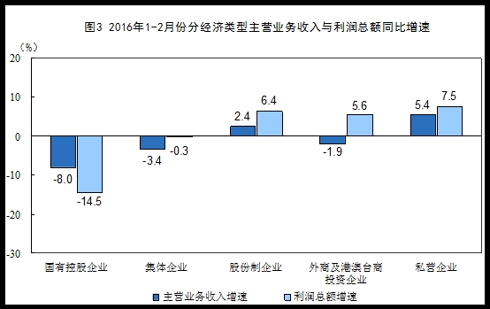 1-2月份,在规模以上工业企业中,国有控股企业实现利润总额1171.3亿元,同比下降14.5%;集体企业实现利润总额63.6亿元,下降0.3%;股份制企业实现利润总额5216.1亿元,增长6.4%;外商及港澳台商投资企业实现利润总额1925.1亿元,增长5.6%;私营企业实现利润总额3103.7亿元,增长7.5%。