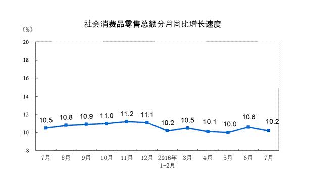 2016年1-7月份,社会消费品零售总额182966亿元,同比增长10.3%。其中,限额以上单位消费品零售额82921亿元,增长7.5%。