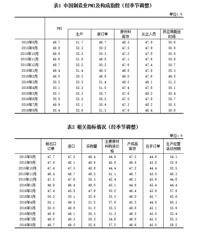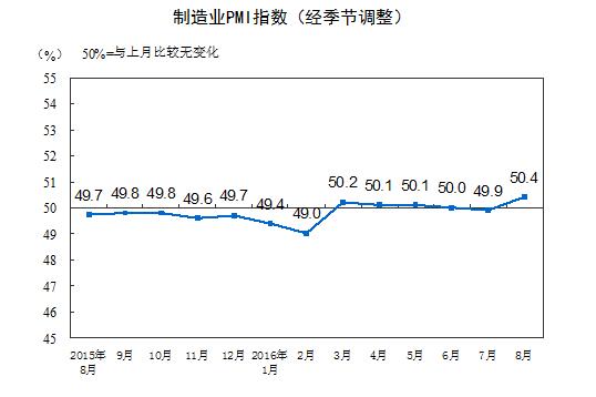 2016年8月份,中国制造业采购经理指数(PMI)为50.4%,比上月上升0.5个百分点,重回临界点之上。