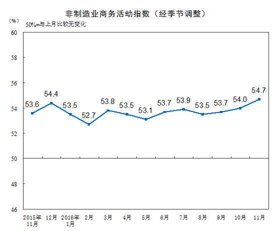 2016年11月份,中国非制造业商务活动指数为54.7%,比上月上升0.7个百分点,连续三个月上升,为2014年7月以来的高点,非制造业延续了平稳较快的增长势头,增速进一步加快。