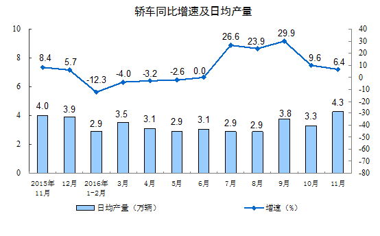 分产品看,11月份,统计的589种主要产品中有394种产品同比增长。其中,钢材9540万吨,同比增长1.7%;水泥21351万吨,增长3.7%;十种有色金属459万吨,增长2.3%;乙烯145万吨,下降0.5%;汽车300.0万辆,增长17.8%;轿车128.1万辆,增长6.4%;发电量5034亿千瓦时,增长7.0%;原油加工量4577万吨,增长3.4%。