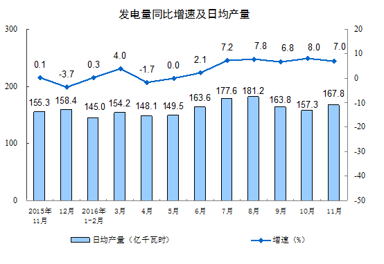 分行业看,11月份,41个大类行业中有30个行业增加值保持同比增长。其中,农副食品加工业增长7.2%,纺织业增长4.1%,化学原料和化学制品制造业增长5.4%,非金属矿物制品业增长6.4%,黑色金属冶炼和压延加工业下降7.3%,有色金属冶炼和压延加工业增长0.8%,通用设备制造业增长8.6%,专用设备制造业增长10.7%,汽车制造业增长19.5%,铁路、船舶、航空航天和其他运输设备制造业增长1.1%,电气机械和器材制造业增长7.5%,计算机、通信和其他电子设备制造业增长8.9%,电力、热力生产和供应业增长9.6%。