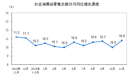 2016年1-11月份,社会消费品零售总额300560亿元,同比增长10.4%。其中,限额以上单位消费品零售额137203亿元,增长7.9%。