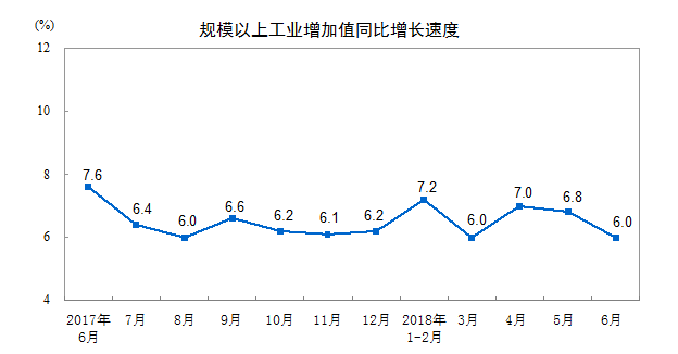 2018年6月份,规模以上工业增加值同比实际增长6.0%(以下增加值增速均为扣除价格因素的实际增长率),比5月份回落0.8个百分点。从环比看,6月份,规模以上工业增加值比上月增长0.36%。1-6月份,规模以上工业增加值同比增长6.7%,增速较1-5月份回落0.2个百分点。