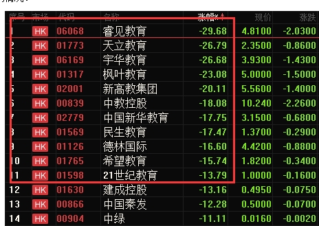 受上述消息影响,周一(13日)上午,在港上市的内地教育股集体重挫,多只个股跳空低开,跌幅逾30%。截至发稿,宇华教育跌幅近30%,新高教集团下跌超20%,中国新华教育、希望教育跌幅均在18%以上。