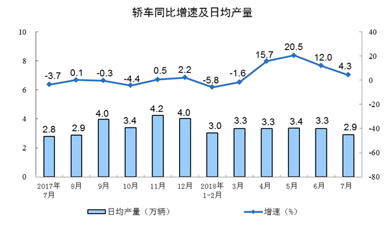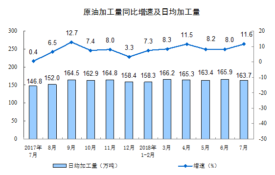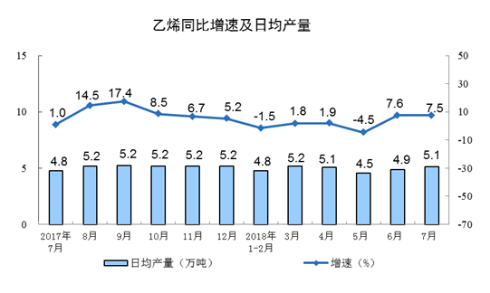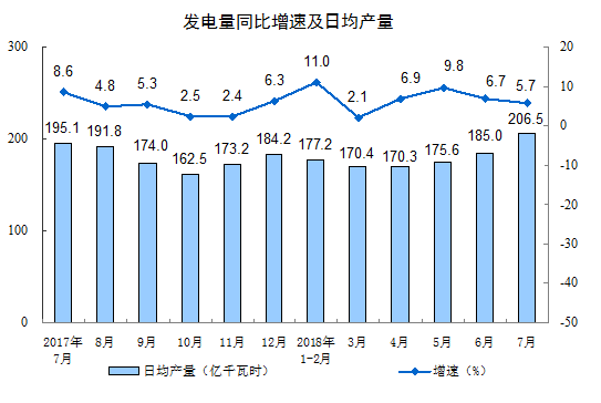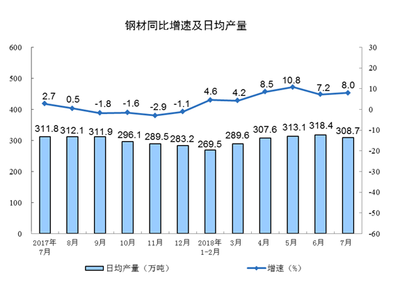 分产品看,7月份,596种产品中有345种产品同比增长。其中,钢材9569万吨,同比增长8.0%;水泥19618万吨,增长1.6%;十种有色金属462万吨,增长8.5%;乙烯158万吨,增长7.5%;汽车206.4万辆,下降0.5%;轿车90.4万辆,增长4.3%;发电量6400亿千瓦时,增长5.7%;原油加工量5075万吨,增长11.6%。