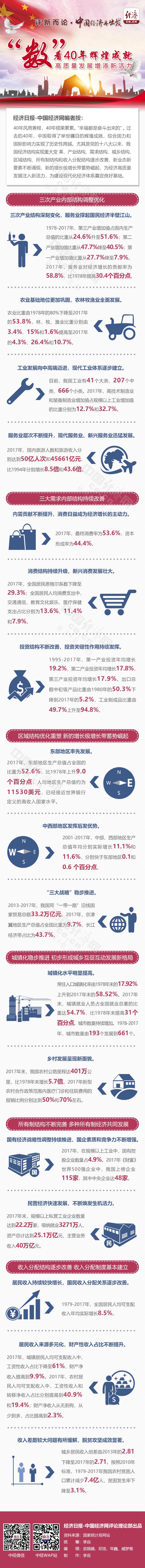 编者按:40年风雨兼程,40年硕果累累。“幸福都是奋斗出来的”。过去的40年,中国取得了举世瞩目的辉煌成就,综合国力和国际影响力实现了历史性跨越。尤其是党的十八大以来,我国经济结构实现重大变革,产业结构、需求结构、城乡结构、区域结构、所有制结构和收入分配结构逐步改善,新业态新要素不断涌现,新的增长极增长带蓄势崛起,为经济高质量发展注入新活力,为建设现代化经济体系奠定良好基础。