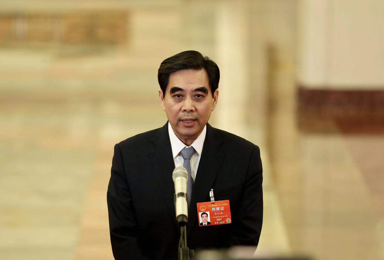 人力资源和社会保障部部长张纪南在“部长通道”接受采访。(摄影/本报记者 车亮)