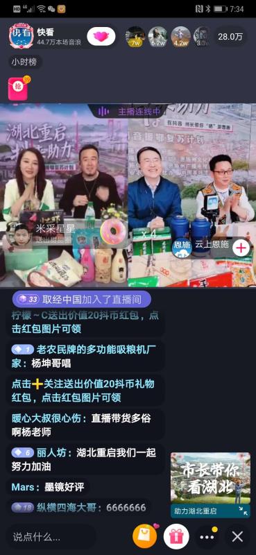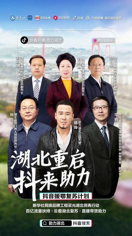 据不完全统计,此次由新华社新媒体中心、音视频部、“快看”财经平台联合抖音邀请来自湖北黄冈、恩施、荆州、荆门、十堰5位市州长参加和嘉宾杨坤做客的直播,短短两个半小时内,销售15种当地特色农产品50多万件。