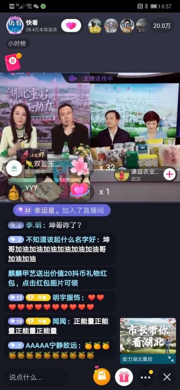 广大网友在积极抢购湖北特色产品的同时,纷纷在直播间点赞新华社。湖北省荆州市副市长邓应军在直播中由衷地表示:“谢谢新华社!”