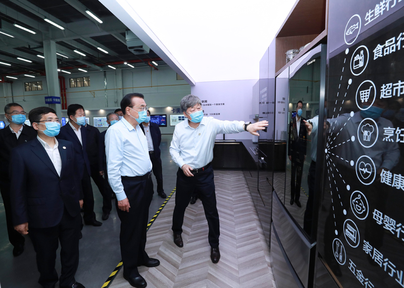 在海尔集团,企业负责人汇报了开展双创和发展工业互联网的情况。李克强观看企业研发推出的多系列智能产品,对他们实行人单合一模式、搭建每个员工成为创客的平台、汇聚海内外各方智慧开展创新表示赞许,勉励他们海纳百川,不断创新,走在时代前列。他要求有关部门在总结企业好做法的基础上,拿出探索大企业协同中小微企业发展、各行业融通发展的改革举措,促进更多新业态发展,带动更多就业。