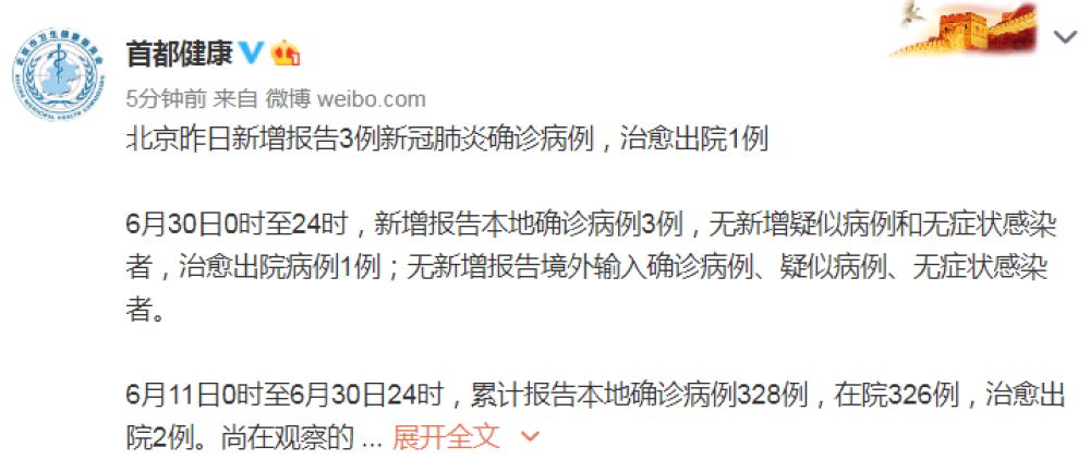 北京6月30日新增本地确诊病例3例 治愈出院1例