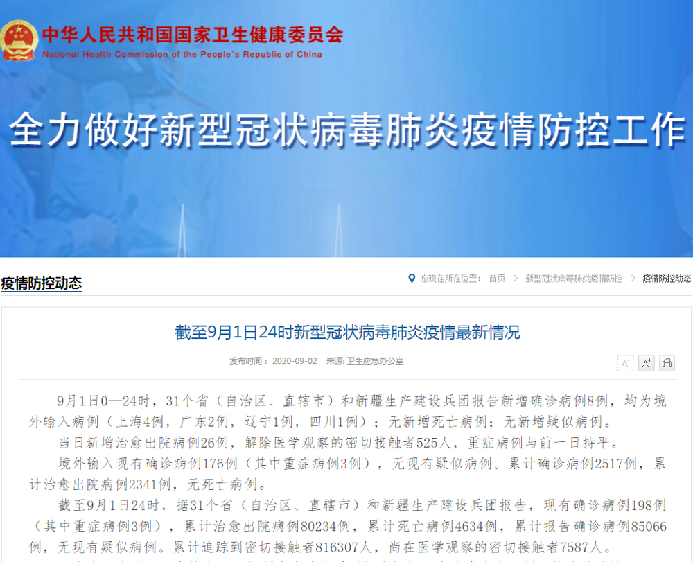 截至9月1日24时,据31个省(自治区、直辖市)和新疆生产建设兵团报告,现有确诊病例198例(其中重症病例3例),累计治愈出院病例80234例,累计死亡病例4634例,累计报告确诊病例85066例,无现有疑似病例。累计追踪到密切接触者816307人,尚在医学观察的密切接触者7587人。