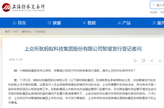 11月5日晚间,上交所就蚂蚁集团股份有限公司暂缓发行答记者问。