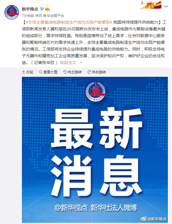工信部新闻发言人黄利斌在26日国新办发布会上说,集成电路作为智能设备最关键的组成部分,需求持续旺盛。特别是疫情带动了线上需求,社会对数据中心服务器和智能终端芯片的需求快速上升,全球主要集成电路制造生产线均出现产能紧张的情况。工信部将支持企业持续提升集成电路的供给能力。同时,积极支持电子元器件和精密加工企业高质量发展,坚决保护知识产权,维护好企业的合法权益。