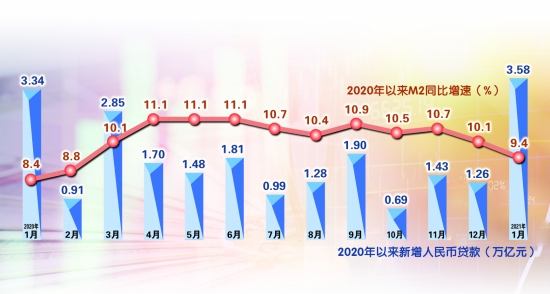 中国人民银行2月9日发布数据显示,1月人民币贷款增加3.58万亿元,同比多增2252亿元,创出新高;1月末,广义货币(M2)余额221.3万亿元,同比增长9.4%;1月末,社会融资规模存量289.74万亿元,同比增长13%。专家表示,1月金融数据反映出金融支持实体经济力度增强。今年“有保有压”的货币调控将进一步发力。