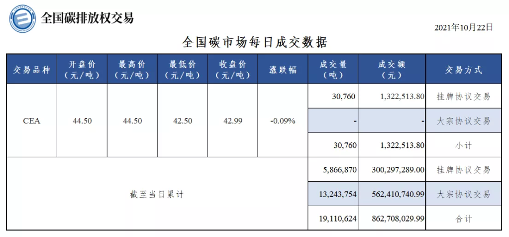 图为全国碳市场10月22日成交数据。 (全国碳交易官方微信公众号截图)