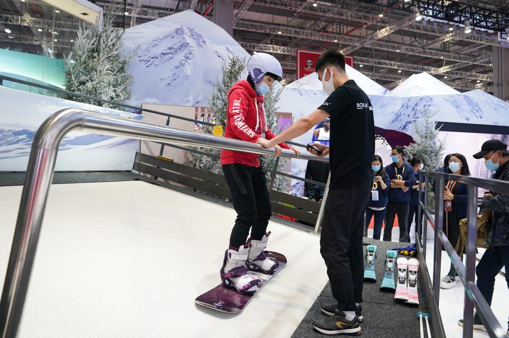 参观者在进博会消费品展区的一家展台体验滑雪。新华社记者 丁汀 摄
