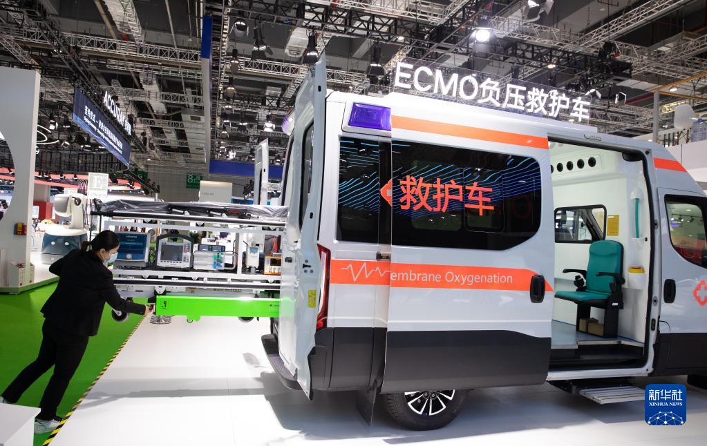 11月8日,在第四届进博会医疗器械及医药保健展区,一家公司展示新款ECMO负压救护车。