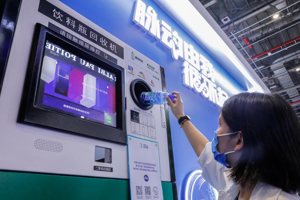 11月6日,工作人员在达能展台将空瓶投入“智能塑料瓶回收机”。新华社记者 张玉薇 摄