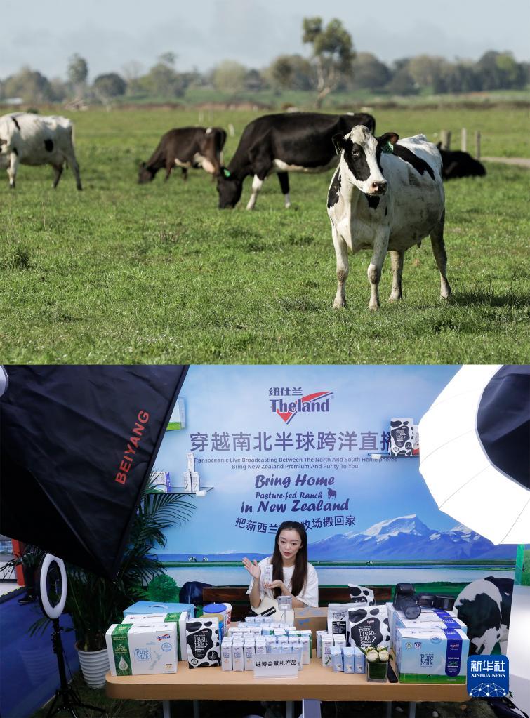 拼版照片:上图为2019年10月4日在新西兰陶波地区拍摄的新西兰纽仕兰乳业牧场内的奶牛(新华社记者郭磊摄);下图为2021年11月9日,工作人员在第四届进博会食品及农产品展区的纽仕兰乳业展台上直播(新华社记者张玉薇摄)。