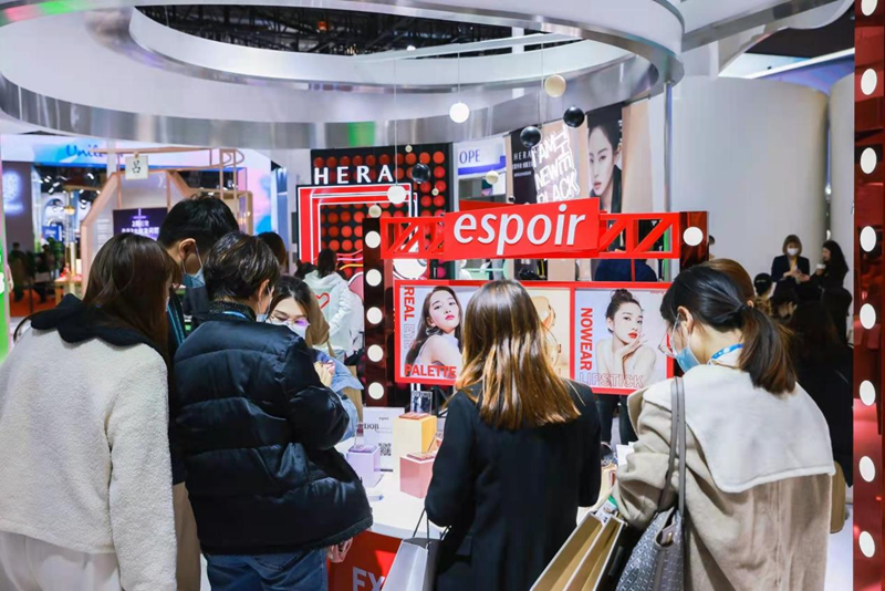 众多观众聚集在爱茉莉太平洋展位。新华网 发