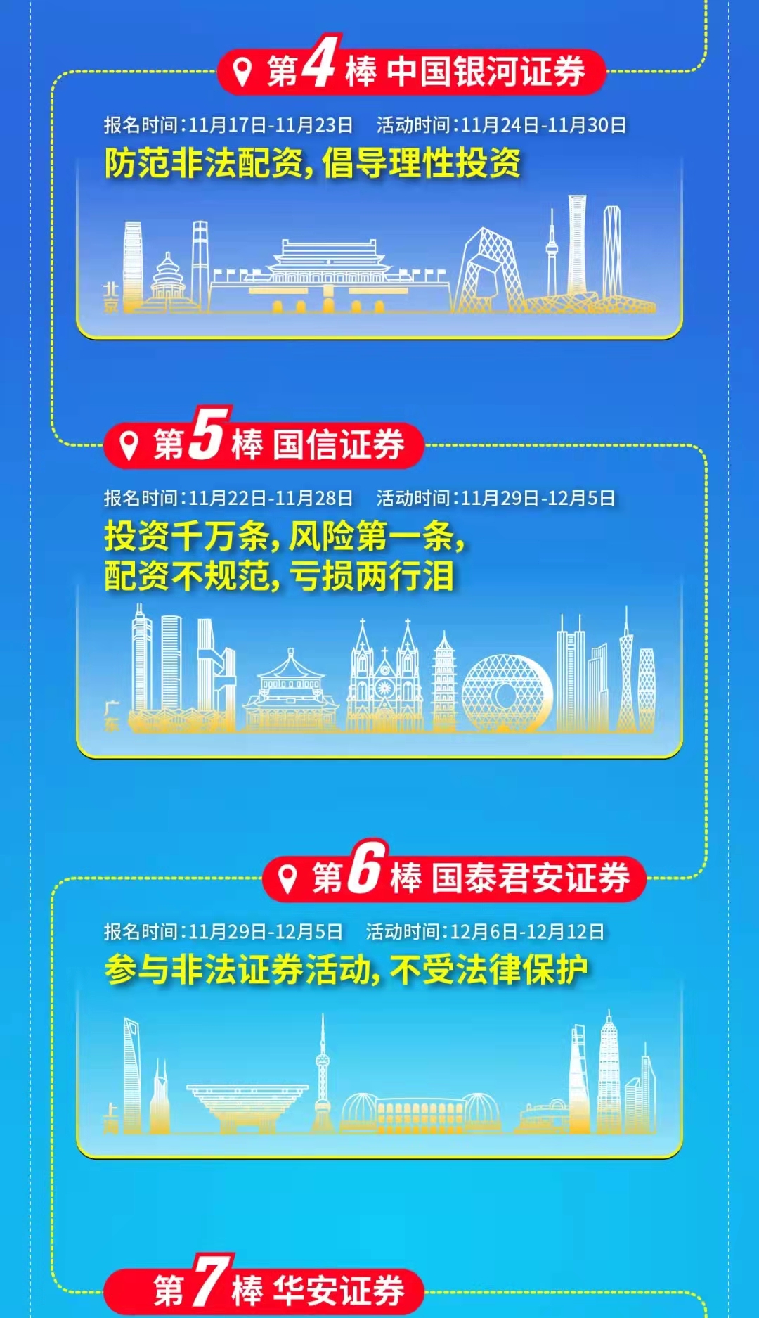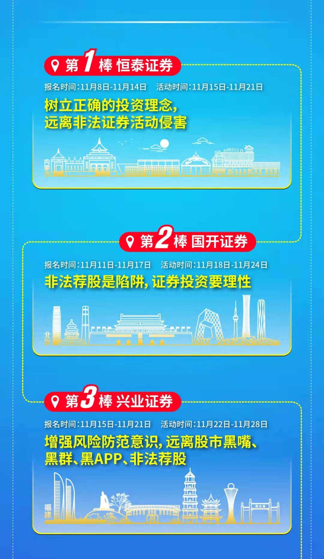 据协会披露,本次活动将有8家券商接棒参与,分别是恒泰证券、国开证券、兴业证券、中国银河证券、国信证券、国泰君安证券、华安证券和开源证券,活动时间为11月15日至12月19日。