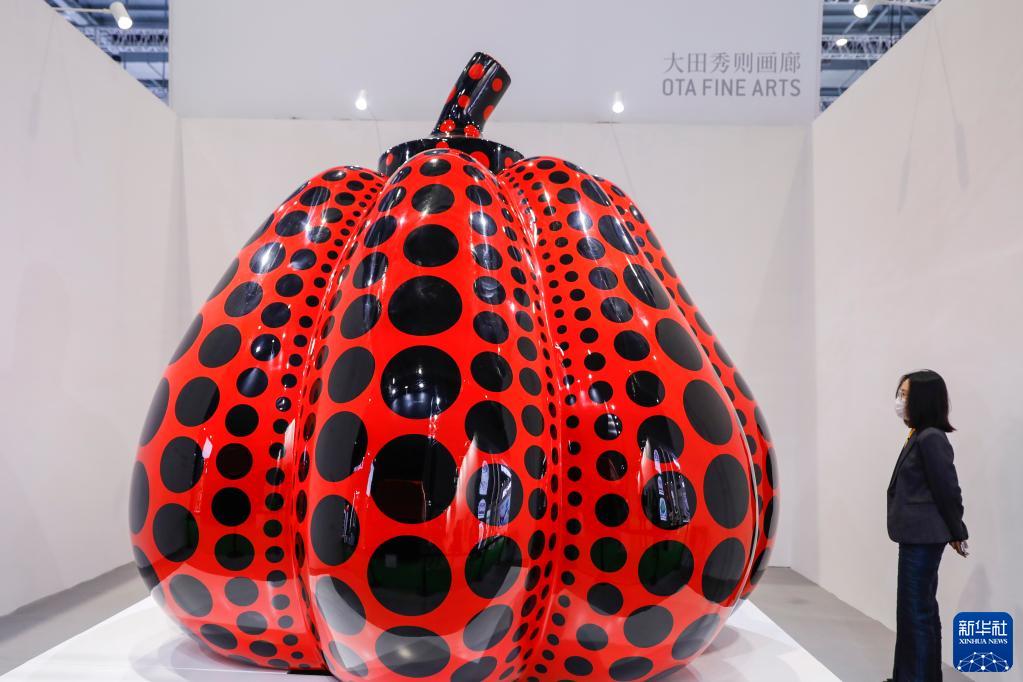 11月5日,观众在第四届进博会服务贸易展区内参观日本艺术家草间弥生的作品《南瓜》。新华社记者 张玉薇 摄