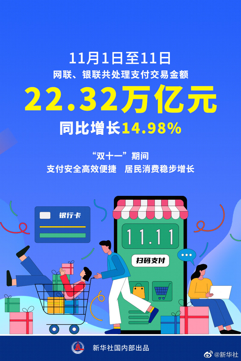 中国人民银行12日发布数据显示,“双十一”期间(11月1日至11月11日)网联、银联共处理支付交易270.48亿笔,金额22.32万亿元,分别同比增长17.96%和14.98%。11日网联、银联合计最高业务峰值9.65万笔/秒。“双十一”期间,支付服务安全、高效、便捷,支付业务规模和居民消费稳步增长。(记者吴雨,海报设计杨轶群)
