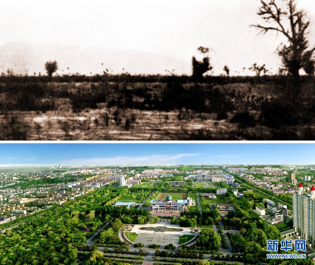 拼版照片:上图为20世纪50年代,石河子开发前的面貌(新疆兵团军垦博物馆提供);下图为石河子夏日美景(新疆生产建设兵团第八师宣传部提供)。新华社发