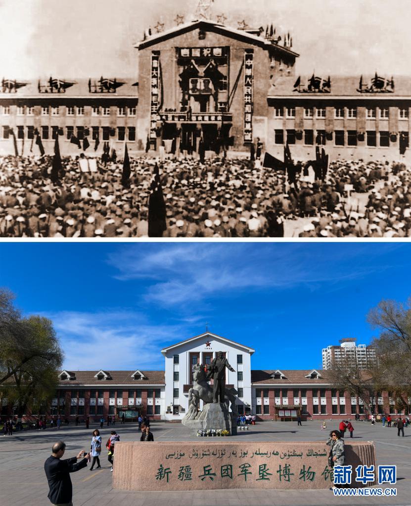 拼版照片:上图为1952年10月拍摄的在石河子落成的中国人民解放军第二十二兵团司令部机关办公大楼(新疆兵团军垦博物馆提供);下图为基于该建筑改建后的新疆兵团军垦博物馆(新华社记者王菲2019年4月9日摄)。新华社发