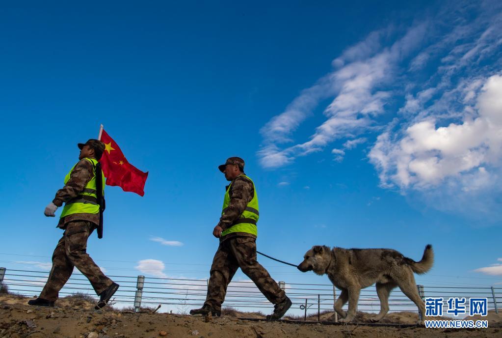 新疆生产建设兵团十师185团职工马军武(右)在巡逻途中(4月9日摄)。新华社记者 胡虎虎 摄