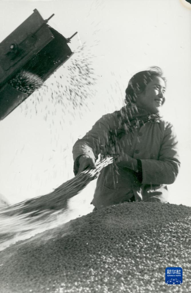 1970年,黑龙江垦区职工享受大豆丰收的喜悦(资料照片)。新华社发