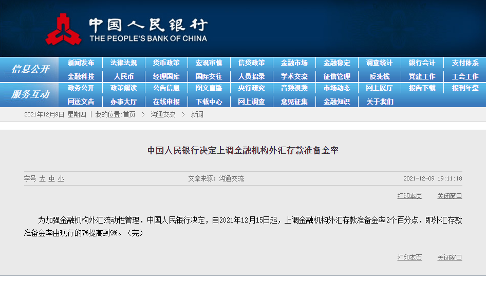 为加强金融机构外汇流动性管理,中国人民银行决定,自2021年12月15日起,上调金融机构外汇存款准备金率2个百分点,即外汇存款准备金率由现行的7%提高到9%。