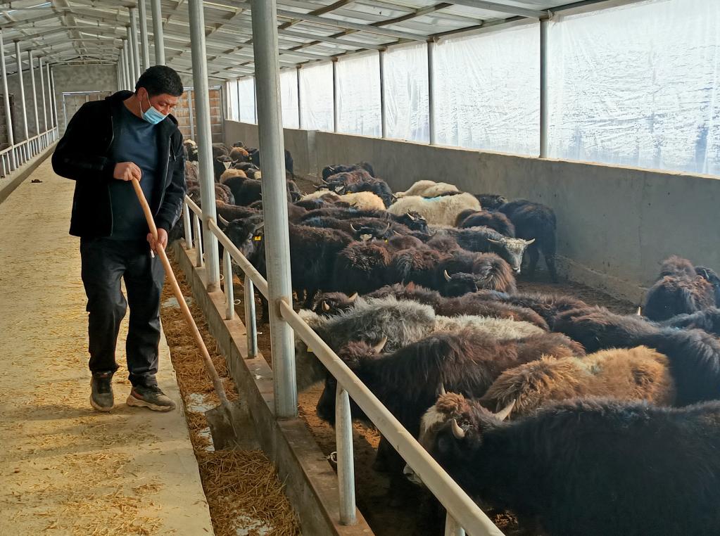 艾则孜·塔依尔在自家养殖大棚里照管幼年牦牛。(新华社记者潘莹 摄)