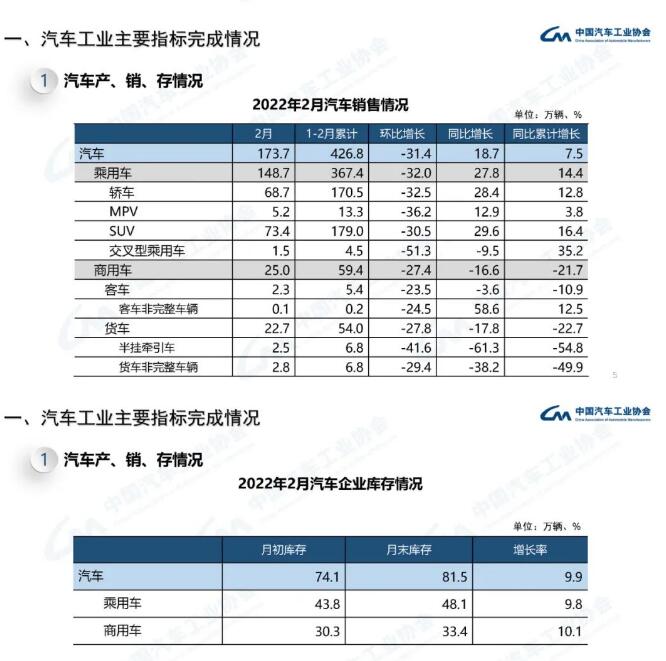 上证报中国证券网讯(记者 俞立严)中国汽车工业协会3月11日发布消息,2022年2月,中国汽车销量173.7万辆,同比上涨18.7%;1-2月累计汽车销量426.8万辆,同比上涨7.5%。在新能源汽车方面,中国2月份新能源汽车销量33.4万辆,同比上涨184.3%。1-2月份累计销量76.5万辆,同比上涨154.7%。